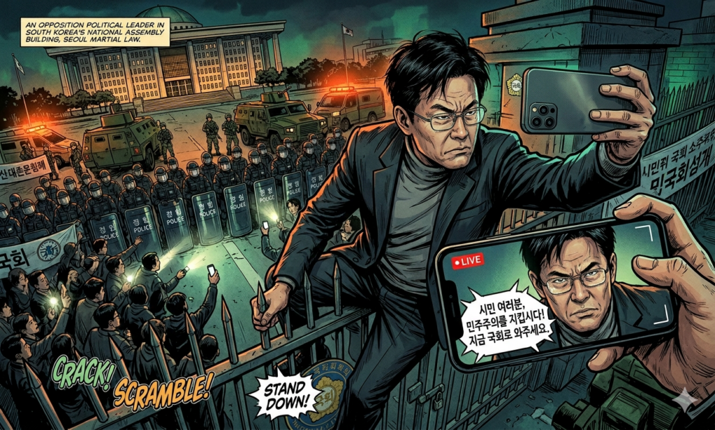 When seeing a political leader livestreaming himself climbing over the walls of the national assembly, we are reminded of the power of visuals and emotions in political communication. This study shows how emotions and protest images jointly shape interaction networks and user engagement during 2024 South Korean martial law crisis.
